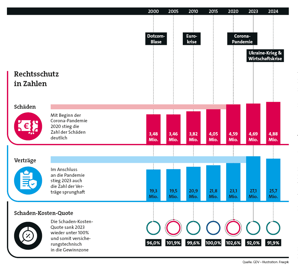 Doch nicht nur die reinen Preise haben die Rechtsschutzversicherung in ein bemerkenswertes Spannungsfeld aus Einnahmen und Ausgaben geschoben. Offenbar hat sich nicht zuletzt durch die Corona-Pandemie und dann noch folgenden Krisen die Mentalität in Deutschland verändert.