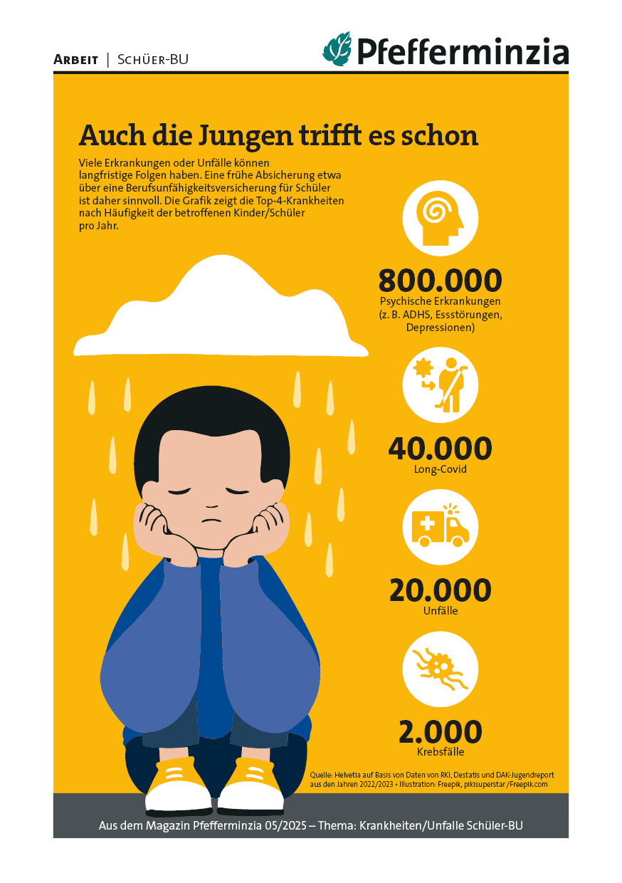 Viele Erkrankungen oder Unfälle können langfristige Folgen haben. Eine frühe Absicherung etwa über eine Berufsunfähigkeitsversicherung für Schüler ist daher sinnvoll. Die Grafik zeigt die Top-4-Krankheiten nach Häufigkeit der betroffenen Kinder/Schüler pro Jahr.