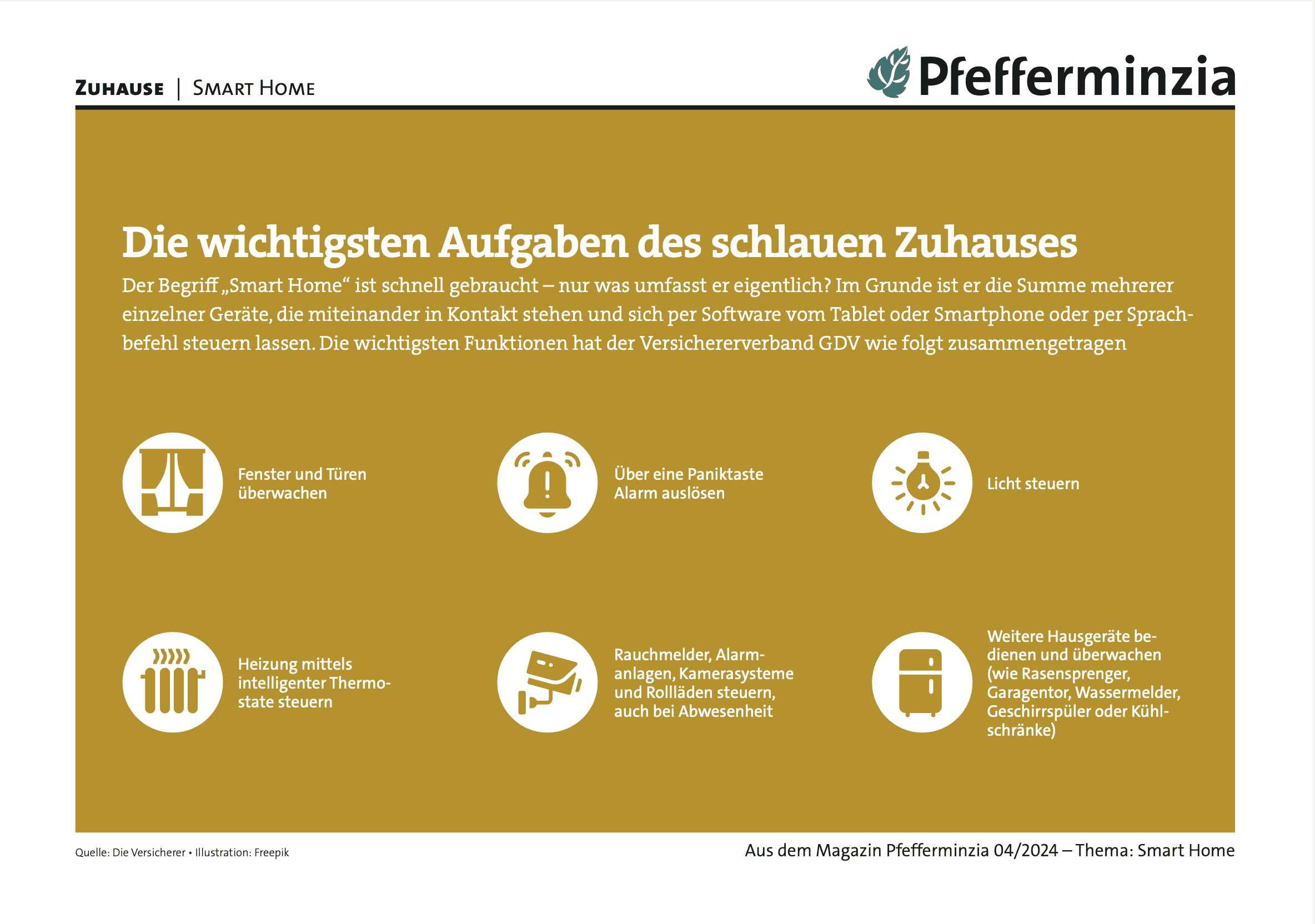 Der Begriff „Smart Home“ umfasst die Summe mehrerer einzelner Geräte, die miteinander in Kontakt stehen und sich per Software vom Tablet oder Smartphone oder per Sprachbefehl steuern lassen. Die wichtigsten Funktionen hat der Versichererverband GDV zusammengetragen.