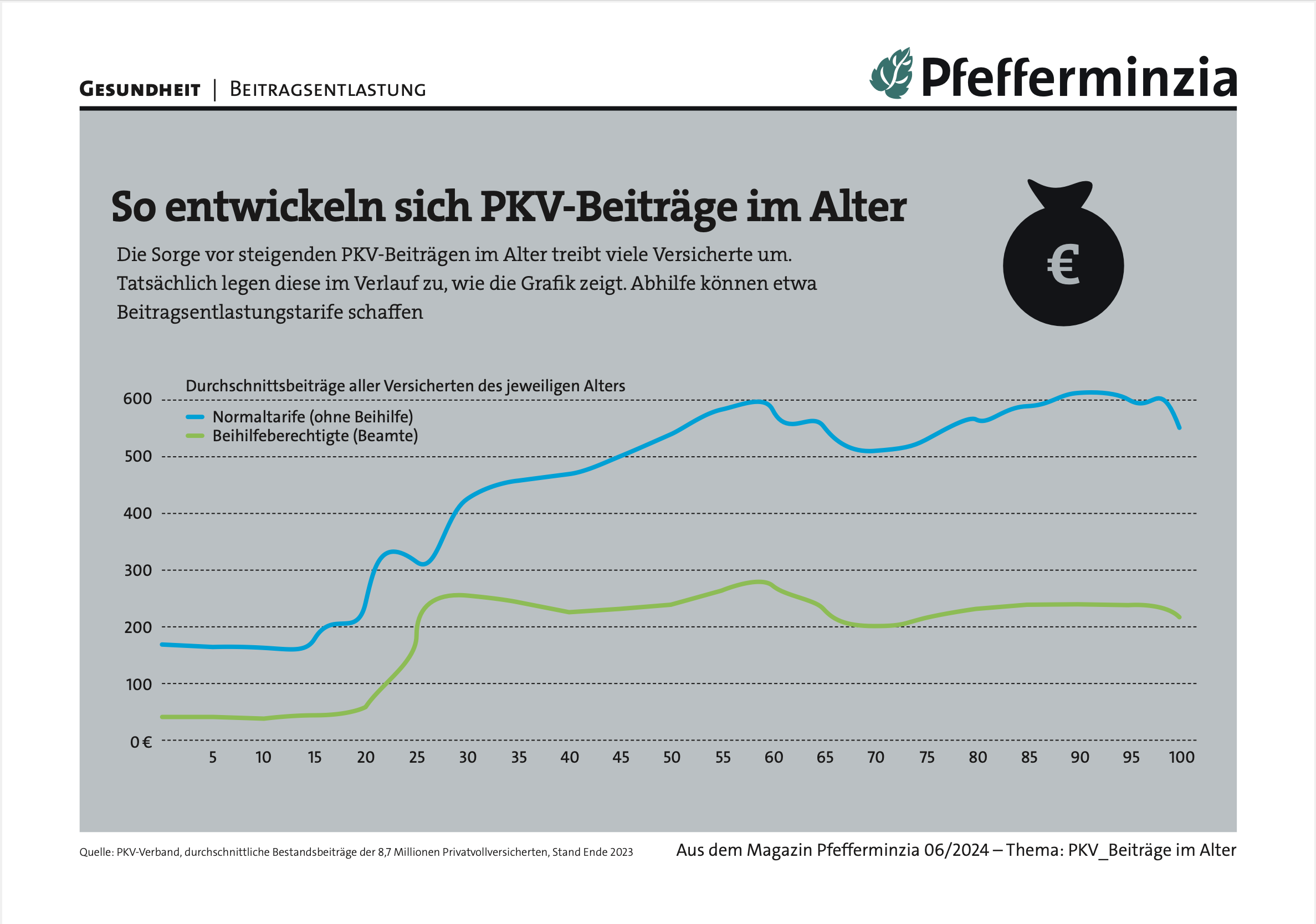Die Sorge vor steigenden PKV-Beiträgen im Alter treibt viele Versicherte um. Tatsächlich legen diese im Verlauf zu, wie die Grafik zeigt. Abhilfe können etwa Beitragsentlastungstarife schaffen.