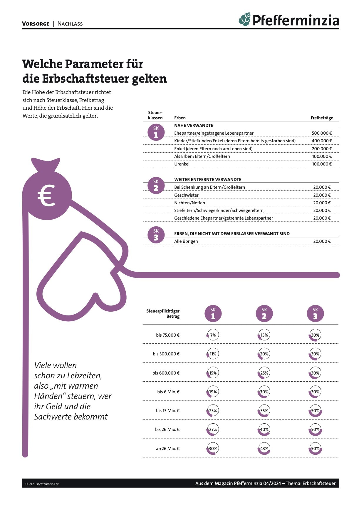 Wer Vermögen, Immobilien & Co. erbt, muss in aller Regel Erbschaftsteuer zahlen. Wie hoch die ausfällt, richtet sich nach Steuerklasse, Freibetrag und Höhe der Erbschaft. Die Grafik zeigt die Werte, die grundsätzlich gelten.