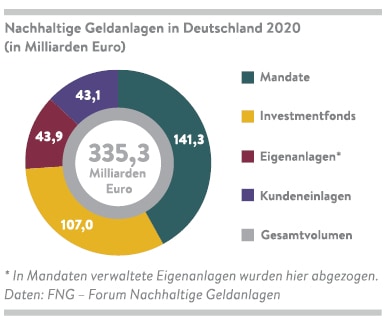 Die Gesamtsumme der nachhaltigen Geldanlagen ist in Deutschland 2020 um 25 Prozent auf ein neues Rekordhoch von 335,3 Milliarden Euro gestiegen. Insbesondere nachhaltige Investmentfonds verzeichneten deutliche Zuflüsse und lagen mit einem Volumen von 107 Milliarden Euro um rund 69 Prozent über dem Vorjahreswert.