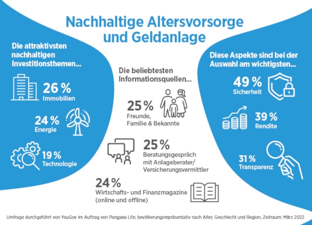 Nachhaltigkeit ist eines der wichtigsten Zukunftsthemen in der Geldanlage und Altersvorsorge. Angesichts von Nullzins, Rekordinflation, Krieg und Klimakrise möchten immer mehr Deutsche ihr Geld so anlegen, dass ihr Erspartes eine stabile Rendite erwirtschaftet, keine sozial und ökologisch fragwürdigen Sektoren unterstützt und einen aktiven Beitrag für mehr Nachhaltigkeit leistet. Welche Präferenzen sie dabei verfolgen, zeigt jetzt eine repräsentative Umfrage im Auftrag des Versicherers Pangaea Life.