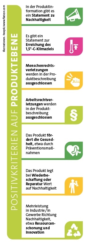 Da es bisher noch keine klaren Begriffe oder eine vollständige Taxonomie gibt, kann es noch keine Negativ- oder Ausschlusskriterien geben. Wir haben jedoch einige Positivkriterien aufgestellt (siehe unten). Wenn wir also die Wahl zwischen zwei Produkten haben, die ein ähnliches Preis-Leistungs-Profil aufweisen, würden wir uns für dasjenige entscheiden, das eines oder mehrere solcher Positivkriterien erfüllt. Umgekehrt haben wir auch definiert, was wir definitiv nicht als nachhaltig empfinden. Wenn Sie sich die Grafik auf der nächsten Seite anschauen, finden Sie da Anbieter und Produkte, die wir künftig ausschließen.