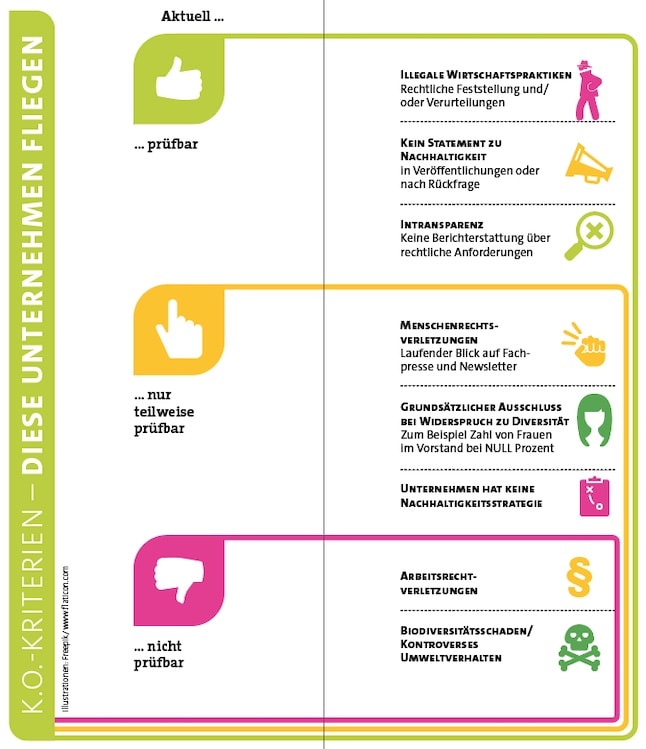 In der Kapitalanlage gibt es eine wesentlich größere Produktauswahl. Hier findet man viele verschiedene Begriffe wie „ESG“, „green“, „sustainability“, „climate“ und so weiter. Wichtig zu wissen ist, dass es unterschiedliche Ansätze gibt, die alle ihre Vor- und Nachteile haben (siehe Grafik auf Seite 2). Daneben gibt es noch die Einteilung von Fonds nach der EU-Verordnung 2019/2088: Artikel 6, graue Fonds: Das sind Fonds, die keine Nachhaltigkeitsziele anstreben. Derzeit noch die Mehrheit der am Markt verfügbaren Produkte.