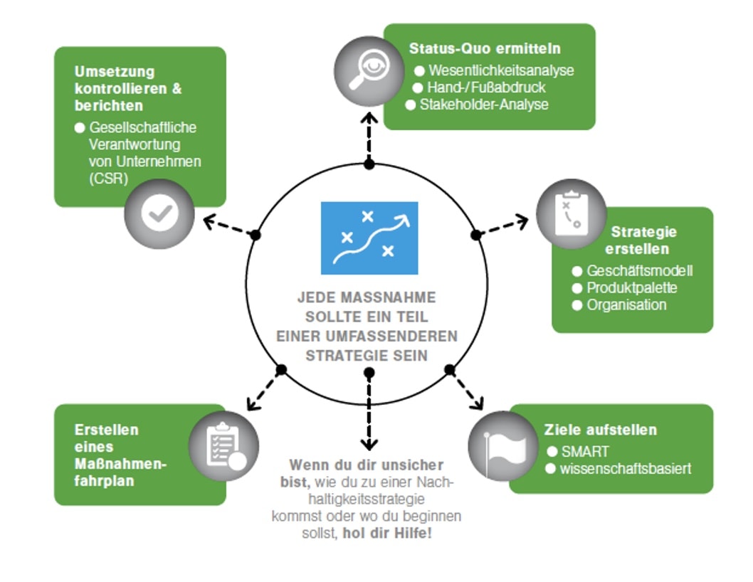 So wie Sie jedes andere strategische Thema (hoffentlich) selbst beziehungsweise gegebenenfalls mit externer Unterstützung bearbeiten und nicht delegieren, so sollte auch Nachhaltigkeit ihre Aufgabe als Geschäftsführer/in oder Inhaber/in sein. Das heißt, Nachhaltigkeit darf sich nicht in werbewirksamen Einzelmaßnahmen („Wir pflanzen jetzt einen Baum für jeden Neukunden!“) erschöpfen, sondern muss ganzheitlich und strategisch begriffen werden. Damit Sie also nicht nur nachhaltige Rentenversicherungen verkaufen oder Hafermilch im Büro anbieten, empfiehlt sich folgendes Vorgehen: