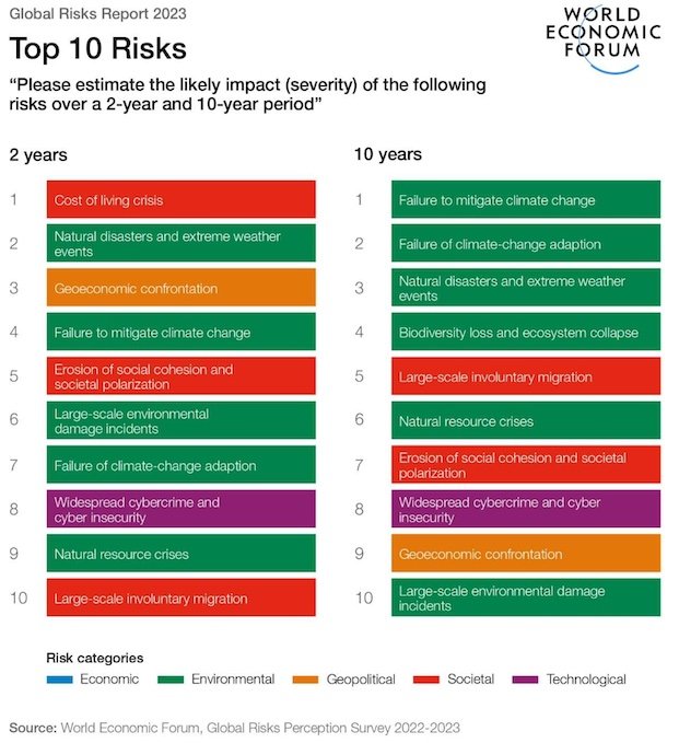 Derzeit dominieren allerdings andere Sorgen – gleichwohl diese auch schon gigantisch sind: So haben gegenwärtig die weltweite Pandemie und der Krieg in Europa die Energie-, Inflations-, Nahrungsmittel- und Sicherheitskrisen wieder in den Vordergrund gerückt. Daraus ergeben sich Folgerisiken, die aus Sicht des WEF in den kommenden beiden Jahren dominieren werden: das Risiko einer Rezession, eine wachsende Verschuldung, eine anhaltende Krise der Lebenshaltungskosten, eine weitere Polarisierung von Gesellschaften durch Des- und Fehlinformation, ein Stillstand bei dringenden Klimaschutzmaßnahmen und ein „geoökonomischer Nullsummen-Krieg“, so die lange Aufzählung der Autoren.