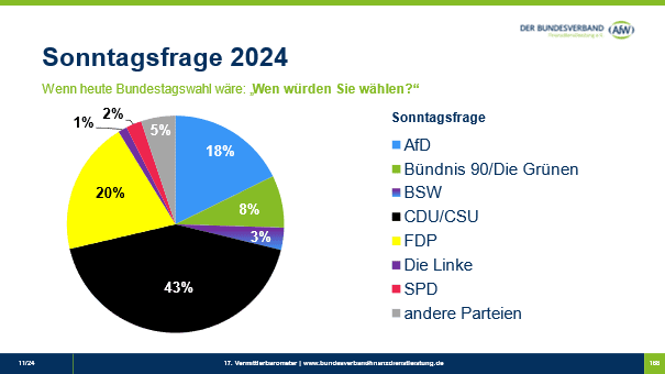 Die Umfrage ergab, dass die CDU/CSU mit 43 Prozent die bevorzugte Partei der Vermittlerschaft wäre. Auf Platz zwei folgt die FDP mit 20 Prozent der Stimmen. Damit wäre eine Koalition aus CDU/CSU und FDP (Schwarz-Gelb) das favorisierte Bündnis unter den Vermittlerinnen und Vermittlern. Die Umfrage wurde Ende Oktober 2024, und somit kurz vor dem Bruch der Ampelkoalition am 6. November 2024, durchgeführt.