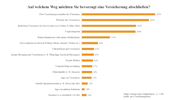 „Beim Abschluss einer Versicherung ist und bleibt Vertrauen entscheidend, der persönliche Vertragsschluss ist weiterhin der Königsweg“, sagt Sven Stark, Insurance Leader Advisory bei PWC Deutschland. Gleichzeitig könnten aber auch gut ausgestaltete digitale Angebote eine Alternative für einen vertrauensvollen Vertragsabschluss bieten. Am besten seien daher die Institute aufgestellt, die in hybride und digitale Kommunikationsangebote investierten.