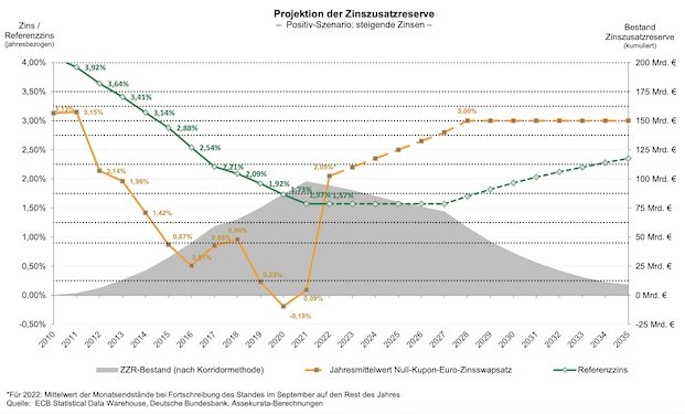Bereits seit 2011 müssen die Lebensversicherer daher eine Zinszusatzreserve (ZZR) bilden, die bis Ende 2021 marktweit auf gut 96 Milliarden Euro angewachsen ist. Aufgrund der deutlich höheren Marktzinsen bleibt der zur ZZR-Berechnung geltende Referenzzins für 2022 stabil bei 1,57 Prozent, was aus Sicht der Studienautoren in diesem Jahr erste Rückflüsse aus der ZZR von branchenweit 3 Milliarden Euro zur Folge hat.