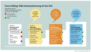 Es steht außer Frage, dass die Versicherungsbranche die neuen Möglichkeiten nutzen und sich in Richtung eines komplett automatisierten Cross-Sellings entwickeln wird (siehe Grafik unten). Zumal Cross-Selling im Vergleich zu anderen KI-Themen eine sehr niedrige Einstiegshürde und eine schnelle Rentabilität aufweist. Dennoch bleibt der menschliche Faktor bestehen: „Entscheidend für gutes Cross-Selling ist und bleibt die persönliche, individuelle Beratung, damit die Versicherungsprodukte wirklich zum konkreten Bedarf des Kunden oder der Kundin passen“, zieht Axa-Bereichsleiter Pape ein Fazit für die Branche.