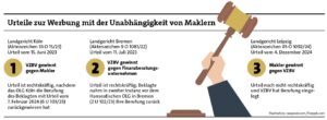 Das sind – auf den Punkt gebracht – die beiden unvereinbaren Standpunkte, die seit anderthalb Jahren in verschiedenen Gerichtssälen aufeinandertreffen. Der Verbraucherzentrale Bundesverband (VZBV) mahnt regelmäßig Maklerinnen und Makler ab, die mit ihrer Unabhängigkeit in der Außendarstellung werben. Schon das erste Urteil in dieser Frage (siehe Kasten unten), das zugunsten der Verbraucherschützer ausging, sorgte für einige Verunsicherung in der Maklerschaft und für empörte Reaktionen aus der Branche.