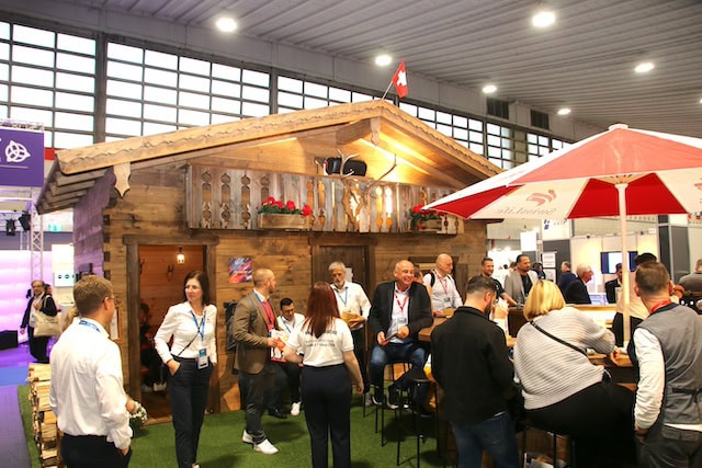 Der DKM-Stand der Swiss Life ist traditionsgemäß geschmackvoll in Form eines Schweizer Chalets gestaltet.