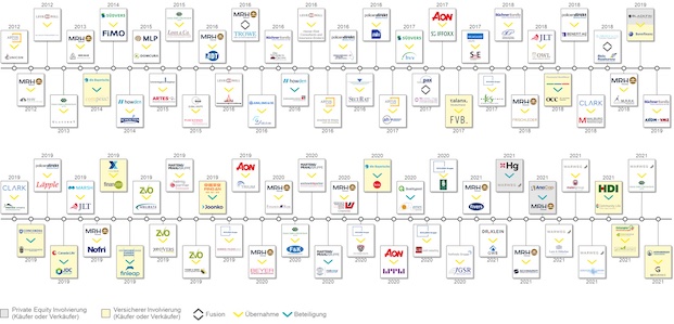 Erste Konsolidierungstendenzen im Maklerumfeld waren bereits vor knapp zehn Jahren zu erkennen. Dazu zählten beispielsweise die Übernahmen von IC Unicon durch die Artus Gruppe (Juli 2012) oder der Erwerb von Glauerdt durch die Gossler, Gobert und Wolters Gruppe (Januar 2013). Auch die Martens & Prahl Gruppe war bereits damals mit Beteiligungen an Maklern aktiv.  Seitdem hat die Konsolidierung weiter an Fahrt zugenommen und umfasst sowohl große bekannte Deals wie den Kauf von Willis Towers Watson durch Aon als auch kleinere, meistens zunächst im Verborgenen stattfindende Deals wie den Erwerb von FinanceRisk durch die MRH Trowe Gruppe oder der CFG und der Schunck Gruppe durch Ecclesia (siehe Grafik).