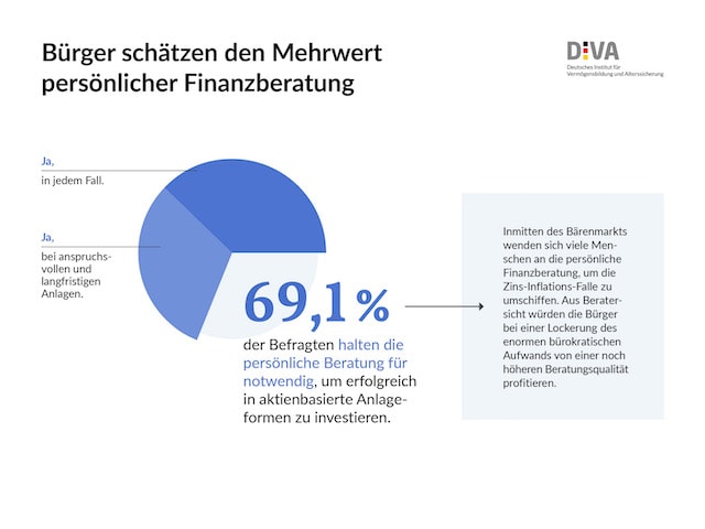 69 Prozent der 2.000 befragten Bürger halten eine Beratung für notwendig, wenn es um aktienbasierte Geldanlage geht – knapp die Hälfte davon vor allem bei anspruchsvollen und langfristigen Anlagen.