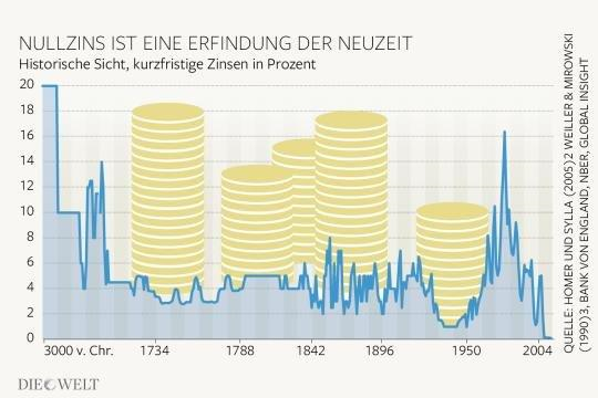 Historiker haben vor 5.000 Jahren in Mesopotamien die ersten Kreditgeschäfte festgehalten. In Babylon wurden 20 Prozent Zinsen bezahlt für Kredite. Im antiken Griechenland beliefen sich die Zinsen für Geldleihgeschäfte auf rund 10 Prozent. Im römischen Reich auf rund 8 Prozent und in Byzanz auf 12 Prozent. Die Kaufleute aus Venedig verrechneten rund 6 Prozent. Jahrhunderte beziehungsweise Jahrtausende später, während der Welteroberung durch die holländischen Seefahrer und Händler notierte das Zinsniveau auf rund 8 Prozent. Während der Englischen Welteroberung im 18. Jahrhundert war das Zinsniveau bei rund 10 Prozent. Wenn wir nach Deutschland blicken, hatten wir im Jahr 1975 durchschnittliche Sparzinsen von 5 Prozent. 1985 lediglich noch rund 3 Prozent. 1995 und 2005 rund 2 Prozent. Im Jahr 2015 hat sich dieses Niveau geviertelt auf noch 0,5 Prozent. 2016 werden wir mehr oder weniger bereits eine Null sehen.