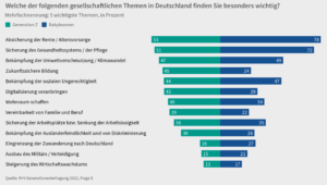 Trotz des massiven gesellschaftlichen Stimmungsabfalls infolge des russischen Angriffskriegs auf die Ukraine sehen die Autoren erfreuliche Entwicklungen: So existiere „der von vielen Seiten beklagte Generationenkonflikt“ in dieser Form nicht – denn bei den wichtigsten gesellschaftlichen Zukunftsthemen setzten beide Generationen die gleichen Prioritäten: Die Absicherung der Renten und der Altersvorsorge steht demnach generationenübergreifend an erster Stelle, gefolgt von der Sicherung des Gesundheitssystems. Erst an dritter Stelle folgt die Bekämpfung des Klimawandels (siehe Grafik).