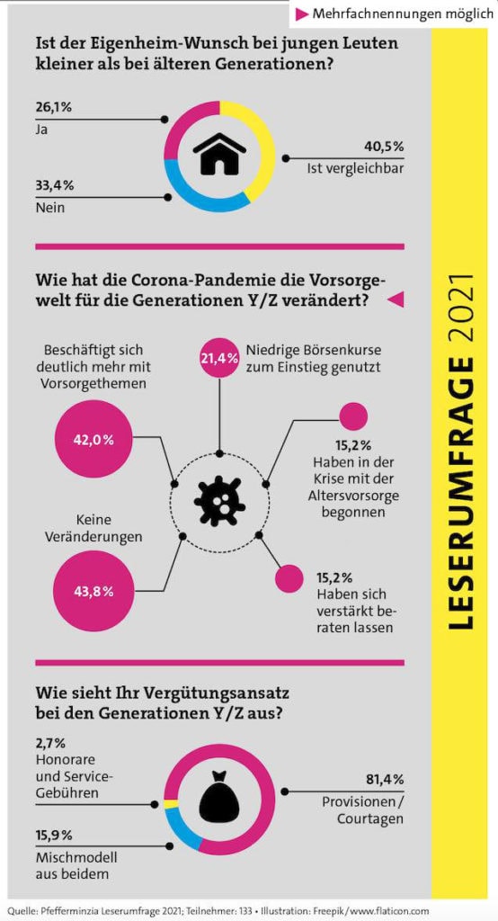 Ein weiteres Ergebnis: Geht es um die Vergütung, setzen die Vermittler bei der Beratung der jungen Zielgruppen überwiegend ganz klassisch auf Provisionen und Courtagen. 81 Prozent machen das so. Rein über Honorare und Service-Gebühren finanzieren nur knapp 3 Prozent ihre Arbeit mit den Generationen Y und Z. Der Rest setzt auf Mischmodelle aus beiden Varianten.