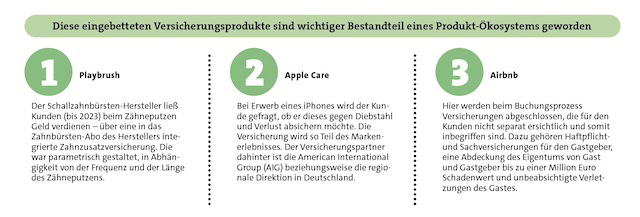 Ein weiteres Problem: Die strenge deutsche Datenschutzregelung erschwert eine personalisierte Produktentwicklung, denn anonymisierte Daten reichen dafür oftmals nicht aus. Die Versicherungsforen Leipzig haben einige Beispiele für erfolgreich eingebettete Versicherungsprodukte zusammengestellt, die zu einem wichtigen Bestandteil eines Produkt-Ökosystems geworden sind.
