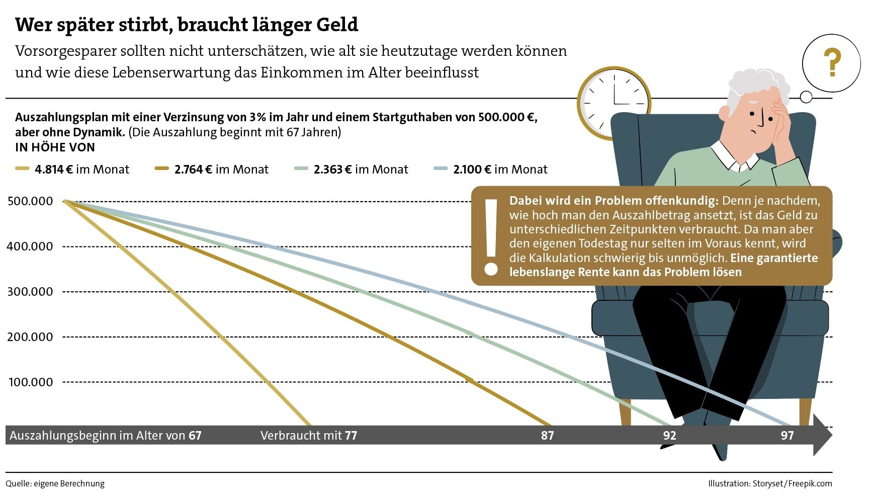 Was solche Lebensdifferenzen mit dem Altersvermögen anstellen, simulieren wir in der Grafik. Darin verteilen wir ein bestimmtes Startvermögen über unterschiedliche Laufzeiten und verbrauchen es dabei. Die Unterschiede sind deutlich zu sehen.