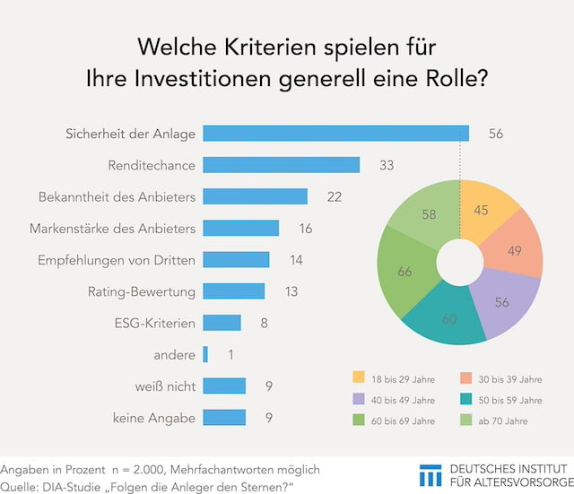 Das zeigt eine Befragung unter 2.000 Personen im Auftrag des Deutschen Instituts für Altersvorsorge (DIA). An dritter und vierter Stelle stehen die Bekanntheit des Anbieters (22 Prozent) und die Markenstärke der Bank, Investmentgesellschaft oder des Versicherers (16 Prozent).