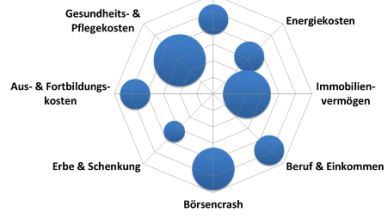 Der Anleger füllt den Fragebogen aus und erhält dann eine Auswertung. Das sieht aus wie ein Radarschirm oder wie ein Spinnennetz mit verschiedengroßen Blasen darin (siehe Grafik). Er erkennt, welche Risiken klein oder groß sind, also mit geringen oder deutlichen Auswirkungen auf seine zukünftige Lebensqualität, und welche näher an ihm dran oder noch weit entfernt von ihm sind, also wahrscheinlich bald oder eher später eintreten werden. Das ist wie ein Röntgenbild, eine Art Risiko-Landkarte. Allein kann der Anleger damit wenig anfangen. Der Berater seines Vertrauens erhält so jedoch eine gute Grundlage für die Beratung und kann entsprechende Lösungskonzepte für die angezeigten Risiken vorschlagen.