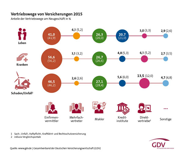 Trotzdem gibt es bestimmte Bereiche, in denen Kunden auch immer öfter online eine Police abschließen. Dazu gehört vor allem die Sparte der Schaden- und Unfallversicherungen, zeigt die aktuelle Vertriebswegestatistik 2015 des Gesamtverbands der Deutschen Versicherungswirtschaft (GDV).