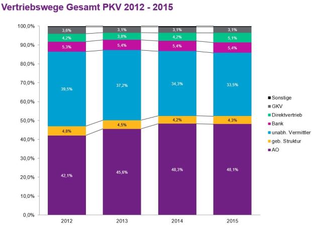 Weiterhin machen AO mit 48,1 Prozent und unabhängige Vermittler mit 33,5 Prozent den Markt größtenteils unter sich aus.