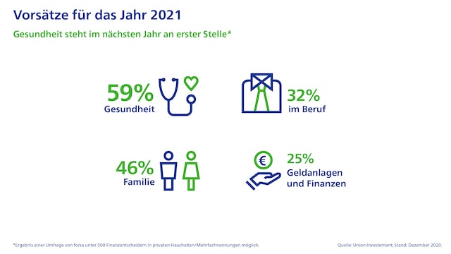 Gute Vorsätze haben viele auch für die Familie gefasst (46 Prozent). Für knapp ein Drittel (32 Prozent) steht der Beruf im Fokus des neuen Jahres. Immerhin ein Viertel (25 Prozent) hat sich vorgenommen, im neuen Jahr die eigenen Finanzen in den Blick zu nehmen. Das sind Ergebnisse aus dem aktuellen Anlegerbarometer der Fondsgesellschaft Union Investment, für die mehr als 500 Finanzentscheider befragt wurden .