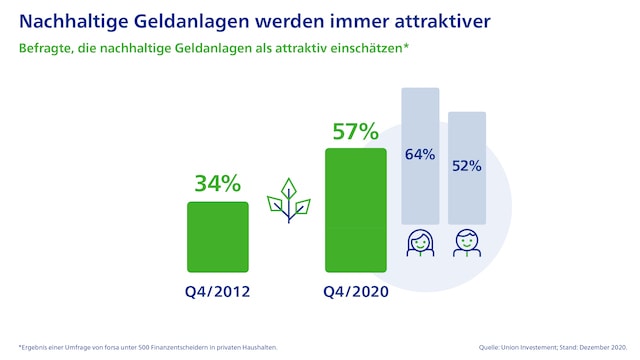 Auch der Anteil derer, die bereits in nachhaltigen Anlagen investiert sind, ist gestiegen – auf 18 Prozent. Dies ist ebenfalls eine neuer Rekordwert im Zeitrahmen von acht Jahren (8 Prozent) und im Vergleich zum ersten Quartal 2020 eine Steigerung um 4 Prozentpunkte. Beim Besitz von nachhaltigen Geldanlagen liegen Frauen und Männer gleichauf.