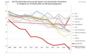 Auch der Blick auf den Verlauf der Garantiezinsverpflichtung der Versicherer (gestrichelte Linie in der Grafik) mache deutlich, „welch große Diskrepanz die Unternehmen bei Auslaufen ihrer alten Rentenpapiere durch die Neuanlage zu verkraften hatten und noch heute haben“, betonen die Experten.