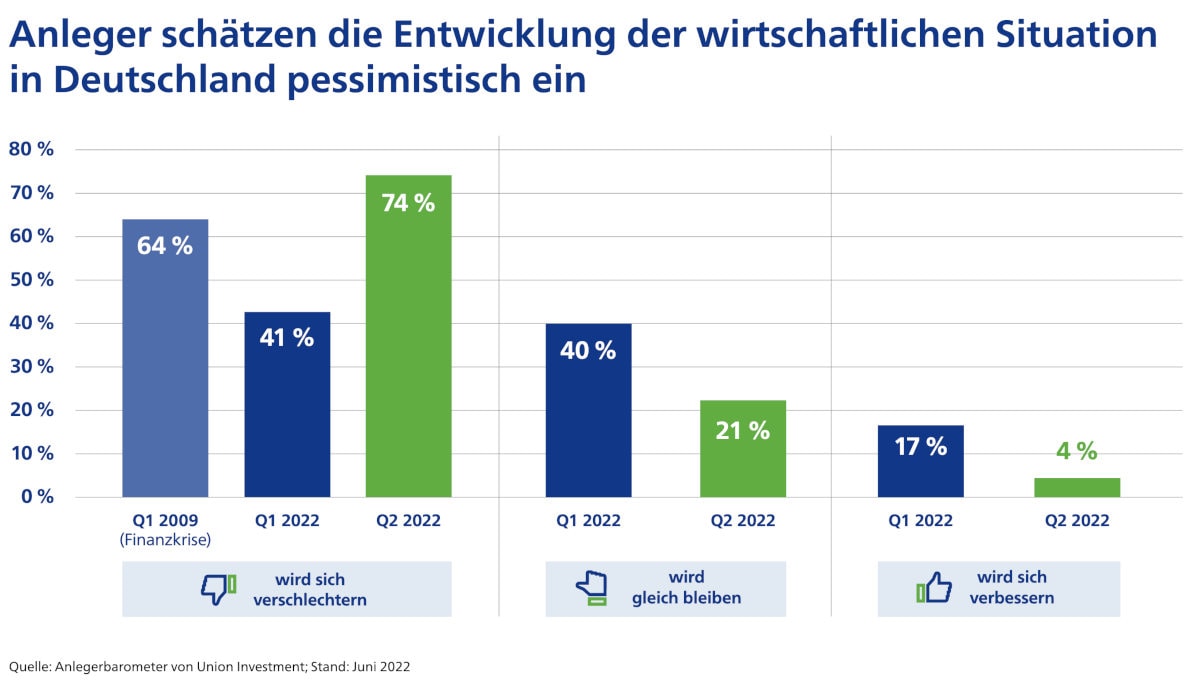 Die Einschätzung der wirtschaftlichen Situation in Deutschland für die kommenden sechs Monate hat sich in diesem Quartal deutlich verschlechtert: Knapp drei Viertel der Deutschen (74 Prozent) erwarten einen konjunkturellen Abschwung. Das sind 33 Prozentpunkte mehr im Vergleich zum Vorquartal. Selbst im ersten Quartal 2009 zu Zeiten der Finanzmarktkrise lag der Anteil mit 64 Prozent unter dem aktuellen Niveau. Das geht aus dem aktuellen Anlegerbarometer der Fondsgesellschaft Union Investment hervor – einer repräsentativen Online-Befragung von gut 1.000 Menschen in Deutschland, die in privaten Haushalten über Finanzen entscheiden.