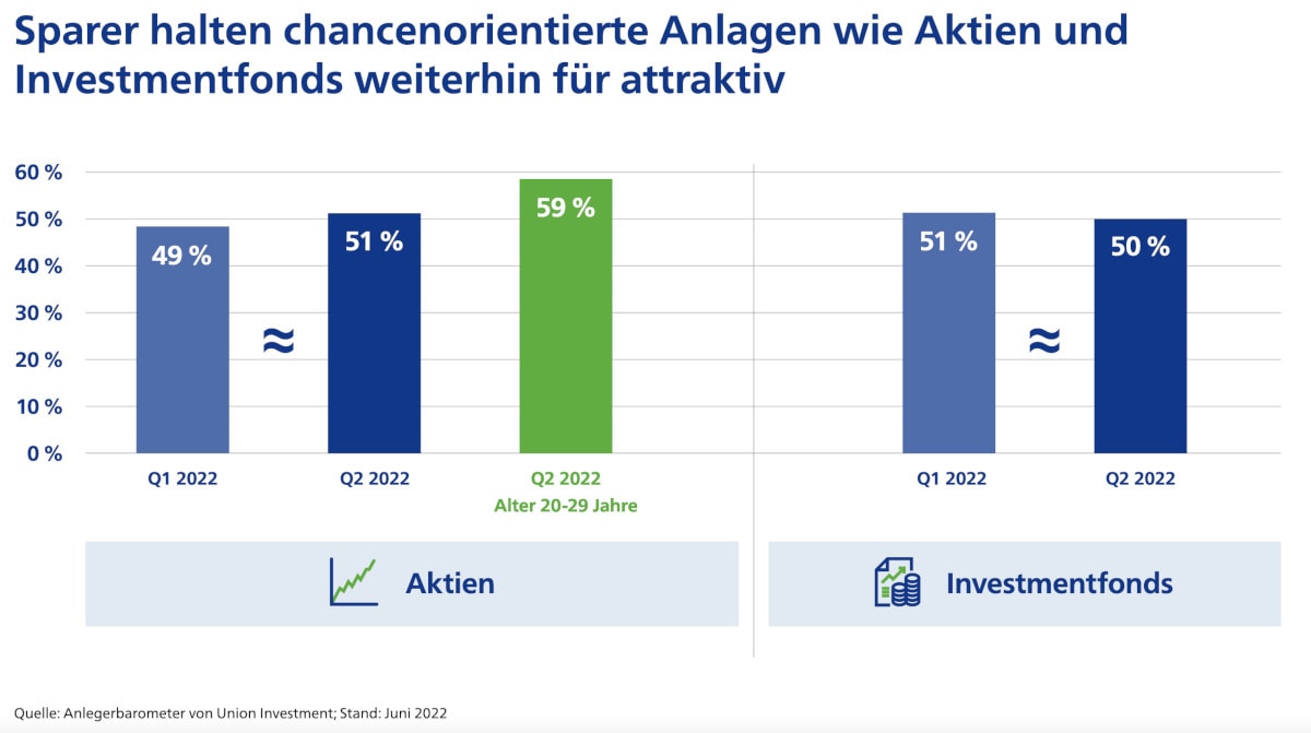 Die Voraussetzungen hierfür sind nach Einschätzung der Fondsgesellschaft gut. Trotz Krieg und den damit verbundenen Konjunktur- und Inflationsrisiken zeigen sich die Befragten insgesamt offen für chancenorientierte Anlagen, insbesondere junge Sparer im Alter zwischen 20 und 29 Jahren. Jeder Zweite (51 Prozent) hält Aktien unverändert für attraktiv (1. Quartal 2022: 49 Prozent), unter den 20- bis 29-Jährigen sind es sogar 59 Prozent. Der Zuspruch zu Investmentfonds bleibt mit 50 Prozent ebenfalls auf dem Niveau vor Kriegsbeginn (1. Quartal 22: 51 Prozent). „Die Evolution des Sparens ist deutlich vorangeschritten. Immer mehr Anleger bleiben auch bei kurzfristigen Kursverlusten gelassen und setzen ihren Fokus auf den langfristigen Vermögensaufbau“, so Gay.