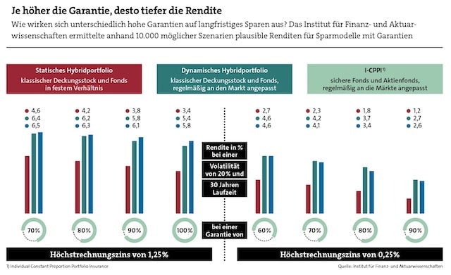 Das Institut für Finanz- und Aktuarwissenschaften näherte sich der Sache in einer Studie. Anhand eines Modells mit rund 10.000 Szenarien errechneten die Forscher, wie unterschiedlich hohe Garantieniveaus bei unterschiedlichen Garantiemodellen wirken. Die Tabelle auf Seite 31 zeigt einige Ergebnisse daraus. Leider fehlen in der Studie Daten für ein Vergleichsmodell ohne Garantie, weshalb der Preis der Garantie an sich nicht ersichtlich wird.