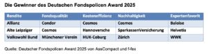Die Sieger des Deutschen Fondspolicen Awards 2025 sind gekürt. Gewinner in der Kategorie „Rendite“ wurden die Versicherer Allianz, Alte Leipziger und Volkswohl Bund. In der Kategorie „Fondsqualität“ konnten sich Condor, Cosmos und Münchener Verein durchsetzen.
