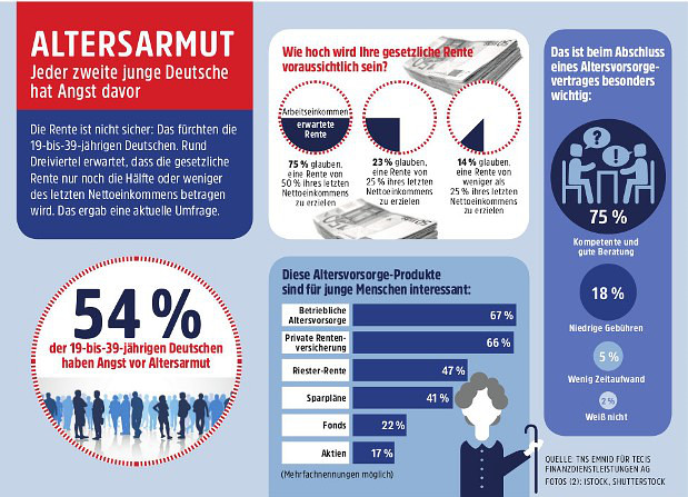 Im Alter ohne ausreichendes Einkommen auskommen zu müssen – trotz jahrelanger Einzahlungen in die gesetzliche Rentenkasse. Diese Sorge treibt viele jüngere Deutsche um. 15 Prozent von ihnen haben große Angst vor Altersarmut, 39 Prozent machen sich Gedanken darüber. Das ist das Ergebnis einer repräsentativen Umfrage von TNS Emnid im Auftrag der Finanzberatungsgesellschaft Tecis.