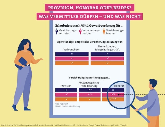 „Wenn es zu Provisionsverboten oder Provisionsdeckeln kommt, werden die Vermittler darauf reagieren. Manche könnten schneller als bisher geplant aus dem Markt ausscheiden, manche dürften gezwungenermaßen zu Honorarvermittlern umsteigen“, sagt Versicherungswissenschaftler und Fachjournalist Matthias Beenken. Sollten Versicherungsvermittler nun also zügig auf Honorarberater umschulen – nur um sicherzugehen?
