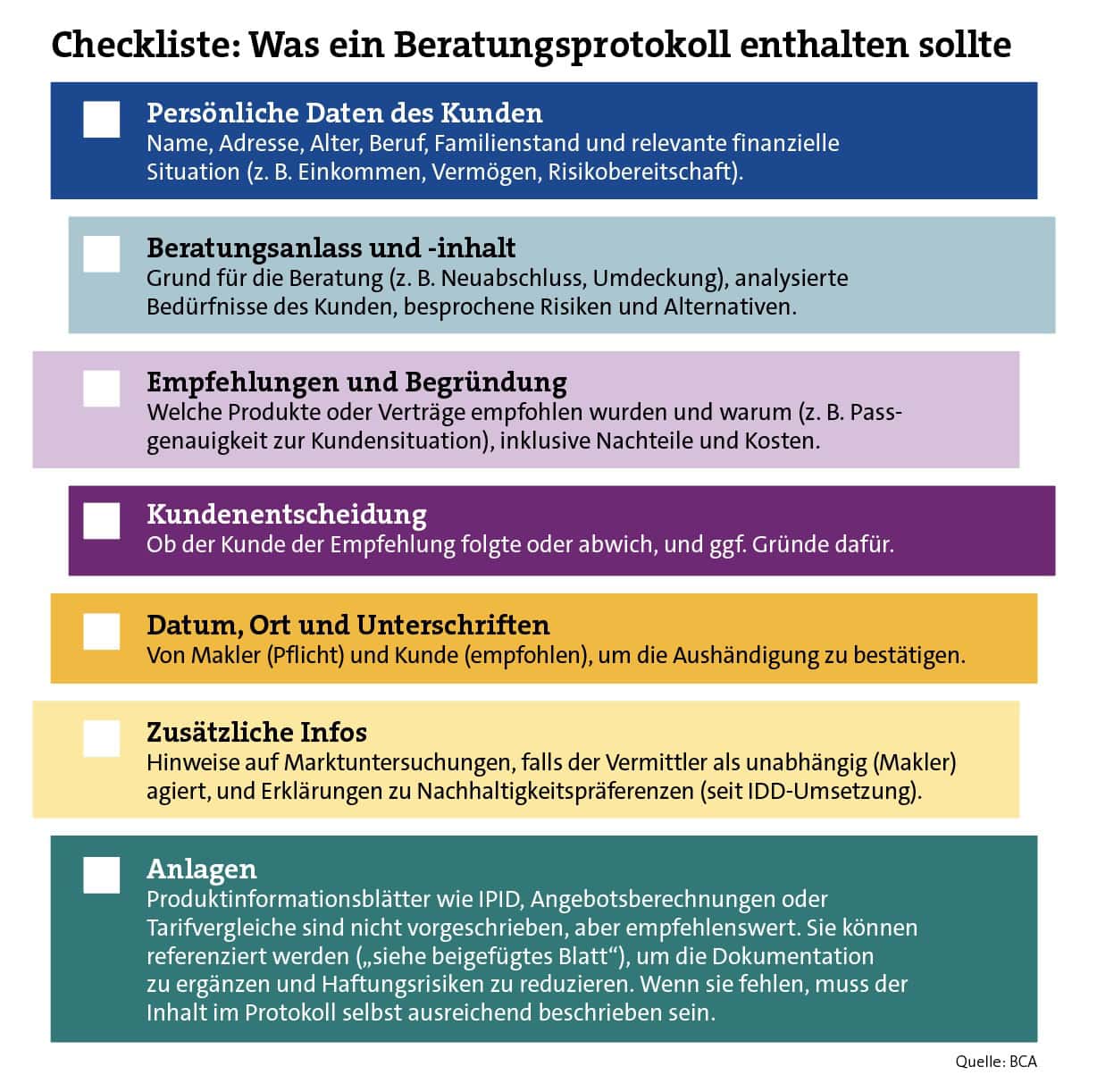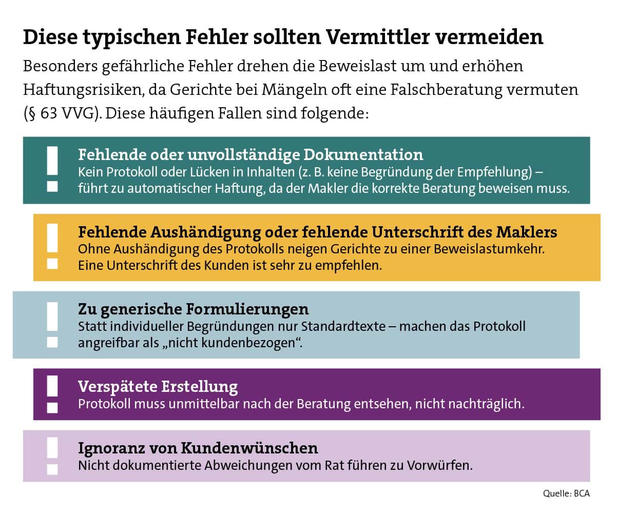 „Wenn sie fehlen, muss der Inhalt im Protokoll selbst ausreichend beschrieben sein“, so Bastian K. Roeder. Der Vertriebsvorstand des Maklerpools BCA beschreibt einen typischen Aufbau: „Eine logische Struktur umfasst eine Kopfzeile mit Kundendaten, Datum, Maklerangaben, den Hauptteil mit Bedarfsanalyse, Beratungsinhalt, Empfehlungen mit Begründung, die Kundenentscheidung und den Schluss mit Hinweisen auf Rechte wie Widerruf und den Unterschriften von Makler und Kunde“, so Roeder weiter.