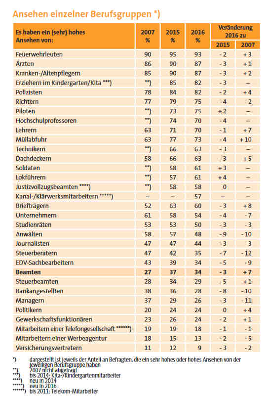 Feuerwehrleute finden alle prima – Versicherungsvertreter dagegen … naja. Welches Image in Deutschland einzelne Berufsgruppen genießen, hat der DBB Beamtenbund im Rahmen einer Studie ermittelt. Im Auftrag des DBB befragte das Sozialforschungsinstitut Forsa rund 2.000 Bundesbürger. Kern der telefonisch durchgeführten Untersuchung war eigentlich der Ruf, den hierzulande der öffentliche Dienst genießt. Die Befragten wurden jedoch gleichzeitig auch um eine Einschätzung des Ansehens verschiedener anderer Berufsgruppen gebeten.