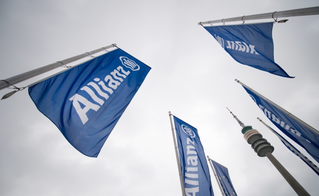 Fahnen wehen vor dem Allianz-Gebäude in München.