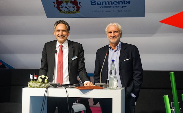 Barmenia-Vorstand Frank Lamsfuß freut sich über den Besuch von Rudi Völler, Sportdirektor bei Bayer Leverkusen. Die Barmenia ist neuer Haupt- und Trikotsponsor des ersten Fußballbundesligisten.