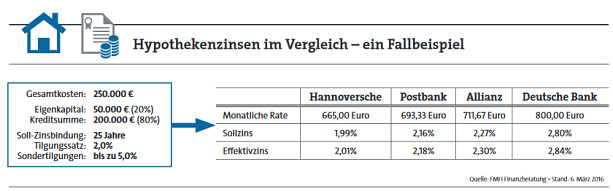 Auch wichtig sei bei derart langen Zinsbindungen ein sauberer Angebotsvergleich. Denn schon kleine Unterschiede können sich über die Dekaden ganz schön zusammenläppern. Ein Beispiel dafür liefert Max Herbst von der FMH Finanzberatung. Anfang März bietet der beste Versicherer bis 70 Prozent Beleihung – Kaufpreis 300.000 Euro, Darlehen 210.000 Euro, 2 Prozent Tilgung, 20 Jahre fest – einen Effektivzins von 1,84 Prozent. Der schlechteste bundesweite Anbieter will 2,43 Prozent haben. Am Ende der 20 Jahre hat der Versicherungskunde beim günstigeren Anbieter also das hübsche Sümmchen von 23.000 Euro gespart. Herbst: „Da lohnt sich ein Vergleich.“