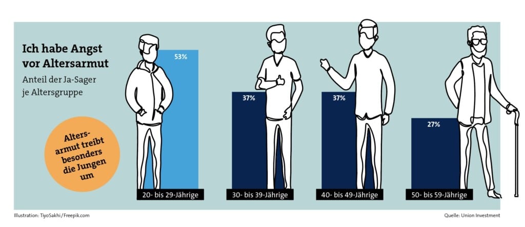 Diese Gemengelage wiegt schwer auf den Zukunftsaussichten der jungen Generationen. Denn Altersarmut ist ein Risiko, das insbesondere viele junge Menschen für sich sehen. 53 Prozent der Personen zwischen 20 und 29 Jahren haben Angst davor, im Alter nicht genug Geld zu haben (Vorjahr: 46 Prozent). Das sind knapp doppelt so viele wie bei den Menschen, die über 50 Jahre alt sind (27 Prozent). Das zeigen Ergebnisse einer Umfrage des Fondshauses Union Investment. 1.006 Personen, die hierzulande im Haushalt über Finanzen entscheiden, wurden dafür befragt.