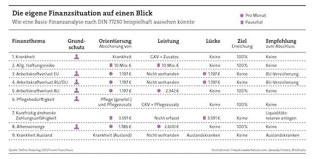 Tatsächlich haben die Initiatoren bereits zum Start der DIN 77230 vor dreieinhalb Jahren versichert, dass die genormte Analyse keineswegs Teil der individuellen Beratung sei, sondern lediglich die Grundlage dafür leiste: So legt die Norm „nur“ fest, welche Daten Vermittler für eine Basis-Finanzanalyse von Privathaushalten erheben sollten und wie sie die individuellen Risiken und Notwendigkeiten der Haushalte identifizieren. Außerdem gibt sie Auskunft darüber, wie die Orientierungswerte zu berechnen sind, an denen sich die Lösungsansätze ausrichten sollen, und wie die Ergebnisse der Analyse darzustellen sind (siehe beispielhafte Darstellung in der Tabelle). Dies umfasst eine Vermögensbilanz, eine Einnahmen-Ausgaben-Rechnung sowie einen Soll-Ist-Abgleich – jeweils in den Bereichen Absicherung, Vorsorge und Vermögensplanung.