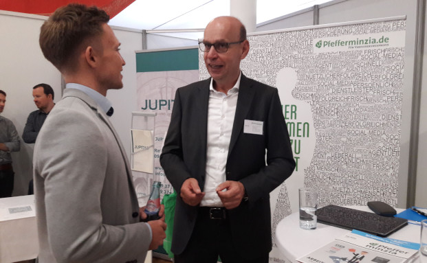 Gut besucht war der Stand von Pfefferminzia. Woher bekommen Sie Ihre Themen? Sind Sie unabhängig? Was kostet eine Anzeige? Wie wird sich die Branche entwickeln? Pfefferminzia-Geschäftsführer Matthias Heß (re.) hatte viele Fragen zu beantworten.