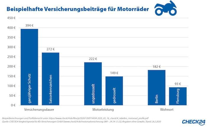 Gleichzeitig hat der Wohnort eines Motorradbesitzers Auswirkungen auf die Beitragshöhe in der Versicherung: Der Halter einer Chopper Honda CMX 500 Rebel zahlt zum Beispiel in Berlin für den Teilkaskoschutz im Schnitt der fünf günstigsten Tarife 182 Euro im Jahr. Für das gleiche Zweirad sind in Flensburg nur 93 Euro fällig – das ist eine Ersparnis von 49 Prozent.