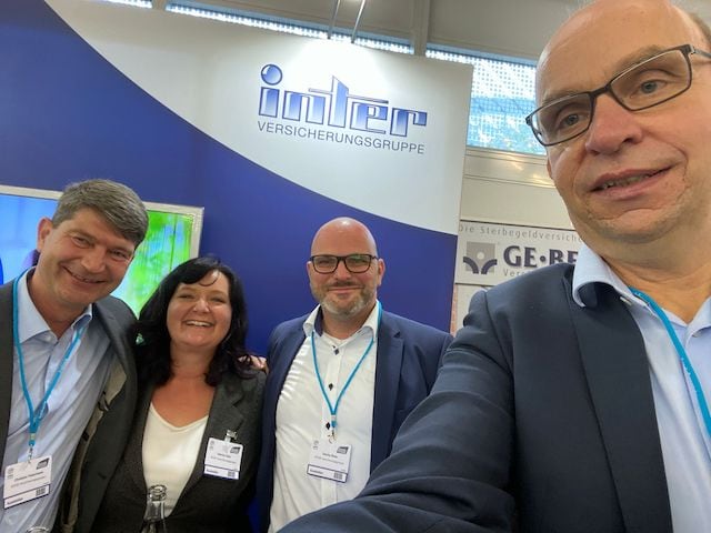 Pfefferminzia-Geschäftsführer Matthias Heß (ganz rechts) schaute am Stand der Inter vorbei und sagte Christian Patermann, Sabrina Usler und Sascha Risse (v.l.) hallo.