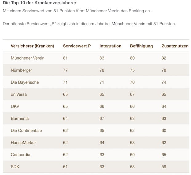 Dabei zeigt sich, dass zwei Maklerversicherer dem maximal erreichbaren Servicewert „P“ von 100 mit jeweils 81 am nächsten kommen – zum einen der Münchener Verein, der damit folglich auch in der Sparte Kranken das Feld anführt (siehe Grafik).