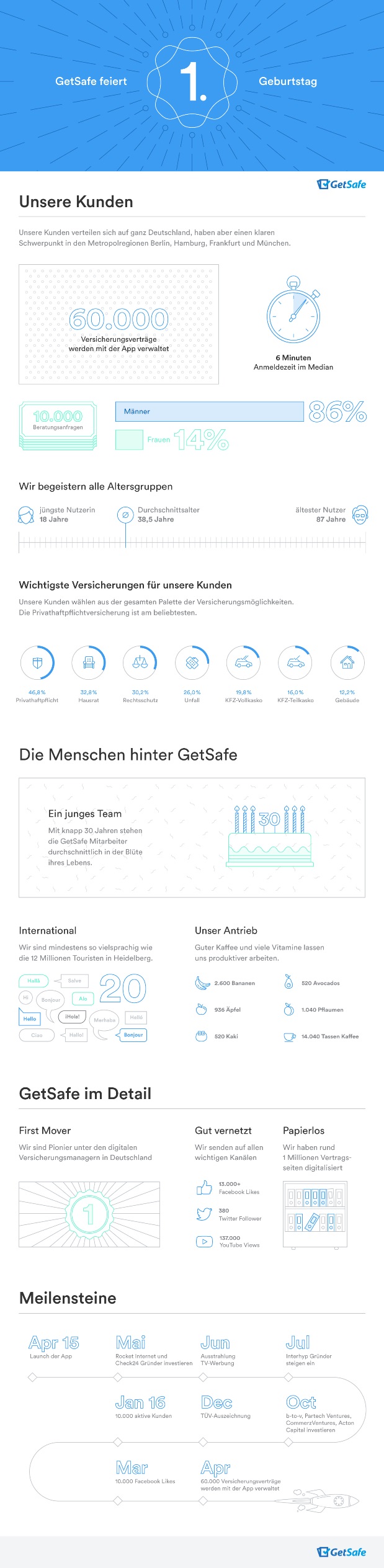 Das Durchschnittsalter eines Get-Safe-Kunden beträgt dabei 38,5 Jahre. 86 Prozent der Nutzer sind männlich. Die Kunden verwalten im Schnitt mehr als vier Versicherungsverträge über die App. Die wichtigsten Versicherungen für Kunden sind die Privathaftpflicht-, Hausrat-, Rechtsschutz-, Unfall- sowie Kfz-Versicherung.