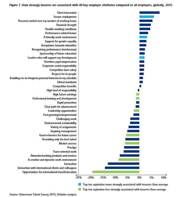 Laut „Deloitte Talent in Insurance Survey 2015“ zeigen nur 2 Prozent der Wirtschaftsstudenten in Deutschland Interesse an einem Job in der Versicherungsbranche. Um dieses Problem zu beheben, müssten die Versicherer nun nicht nur Argumente in puncto Arbeitszeit und Sicherheit herausstellen, sondern auch vorhandene kreative Aufgaben und Karrierechancen betonen, so die Deloitte-Analysten.